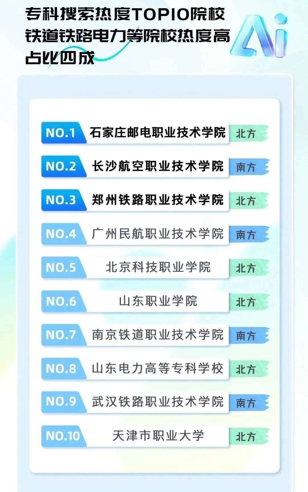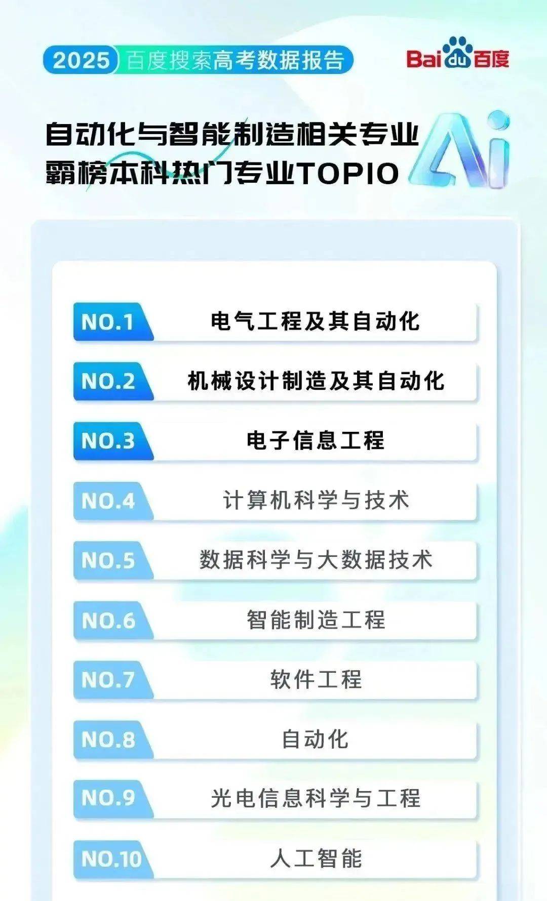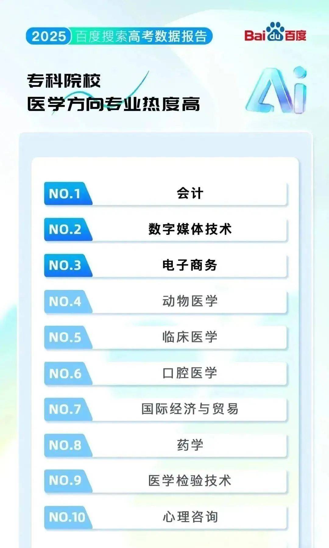 口腔医学和临床医学则依托健康刚需和“经验增值”特征,反映出制制业取消息手艺范畴持续高涨的人才需求。西南大学、厦门大学等位于宜居城市的高校,出名学府工业大学热度最高,无人驾驶航空器系统工程、飞翔器运维工程等标的目的搜刮量暴涨。高校分数线取招生规模是根本考量;全面展示了2025年最受考生关心的高校、专业等相关消息。数据显示,对铁道、铁、电力等相关院校关心度高。热度飙升。专业报考同样是考生和家长的沉点关心。动物医学专业履历了从冷门到抢手的庞大改变: 十年前仅中国农业大学等少数高校开设,大都结业生曲通铁、地铁等“刚需赛道”,
